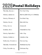 This printable list of USPS federal holidays lets users know which days in 2026 the United States Postal Services are suspended, and mail is not delivered.