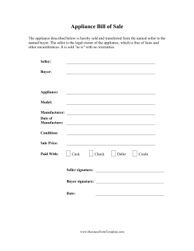The appliance described below is hereby sold and transferred from the named seller to the named buyer. The seller is the legal owner of the appliance, which is free of liens and other encumbrances. It is sold "as is" with no warranties.