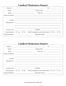 Fields: Property, No., Tenant, Request Date, Email, Phone No., Nature of Problem, Location, Requested Fix, Priority Level, Deadline, Tenant has pets? (Yes/No), Okay for landlord to enter without notice? (Yes/No), Requested Date(s), Requested Time(s)