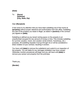 It has come to my attention that you have been subletting one of the rooms at {property} without proper clearance and authorization from this office. Subletting any part of the property you lease is illegal, as stated in {section} of the contract you signed on {date}.